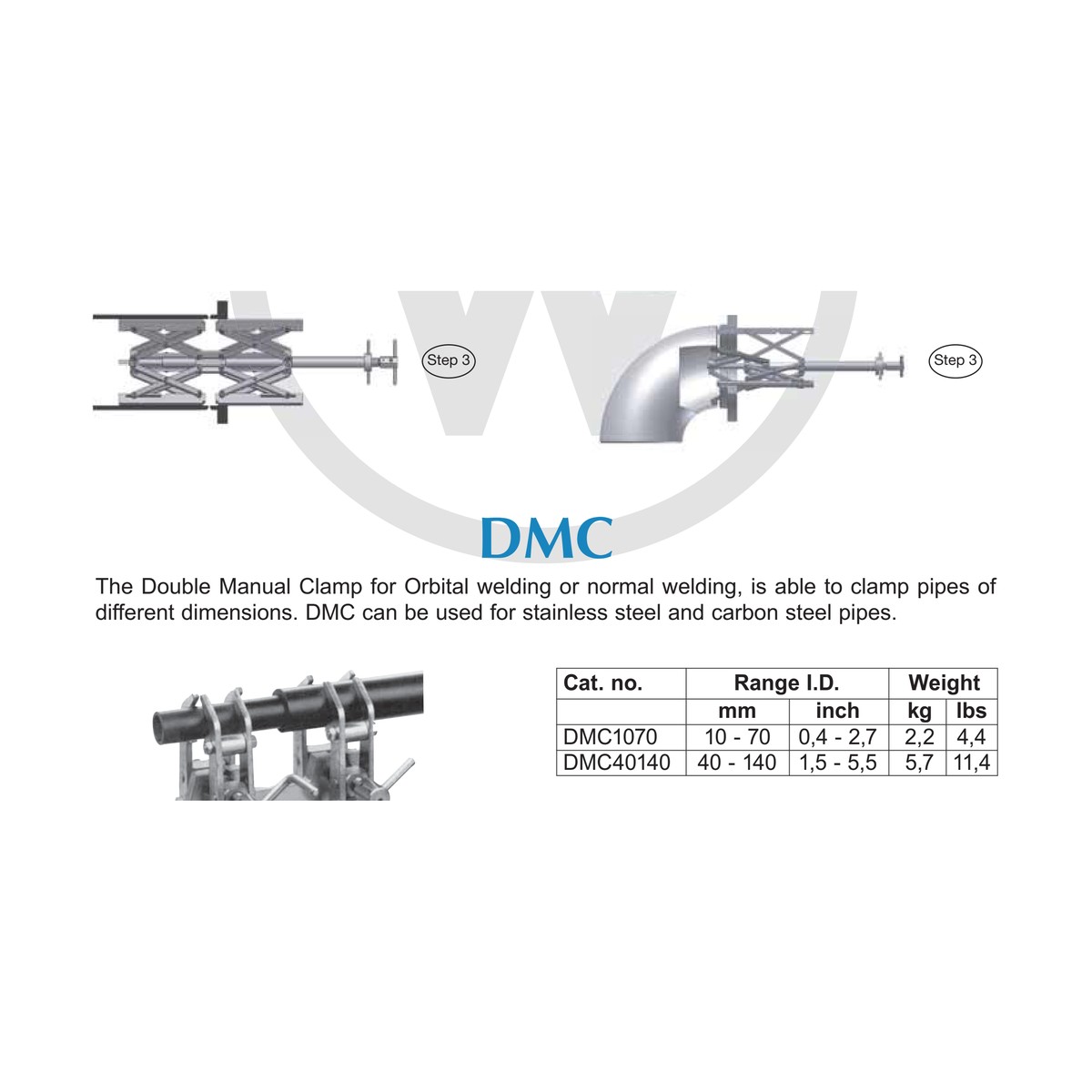 Clemă Dublă Manuală DMC Weld-Tech — prindere sigură și aliniere precisă pentru țevi din inox și oțel carbon, 10–140 mm