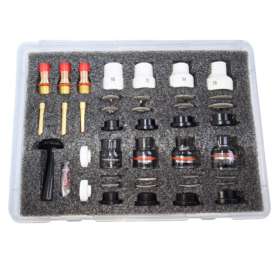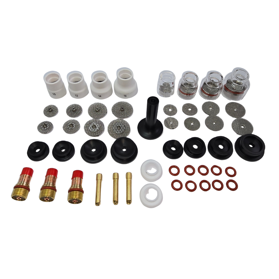 Set duze ceramice și sticlă PYREX pentru sudură TIG, configurat pentru sudori profesioniști care au nevoie de control maxim, vizibilitate crescută și debit stabil de argon. Acest set complet conține 54 de piese compatibile cu pistoletul TIG WP17 / WP18 / WP26 și include duze ceramice standard, duze PYREX transparente și accesorii pentru diferite grosimi de tungsten.